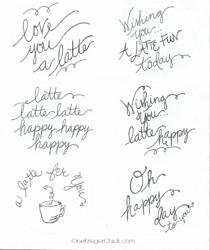 For the Free Printable, simply print on white Cardstock and cut out. Each tag is the size of a 3 inch circle. Cut along the line with scissors or use a 3 inch hole punch. Latte themed handwritten Gift Tags I OneKriegerChick.com